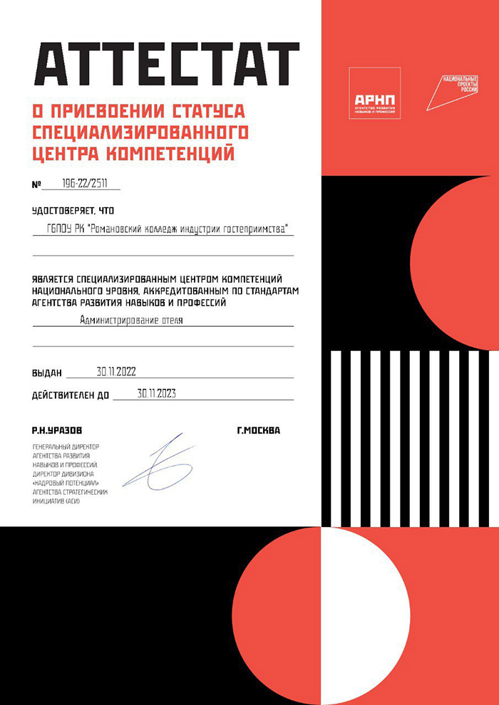 Аттестат № 196-22/2511 от 30.11.2022 ГБПОУ РК "РКИГ" о присвоении статуса СЦК национального уровня, аккредитованным по стандартам "Агентства развития навыков и профессий" по компетенции "Администрирование отеля" сроком на 3 (три) года.