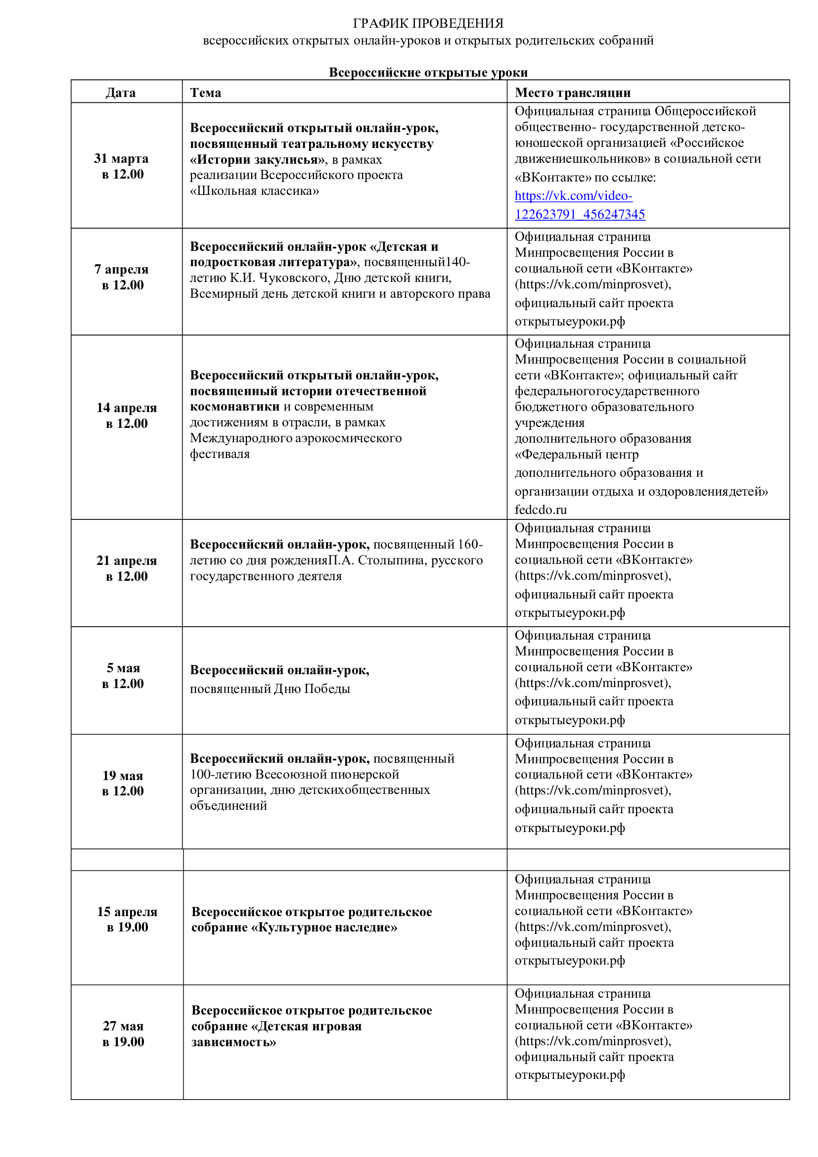 серии всероссийских открытых онлайн-уроков и открытых родительских собраний согласно графика.