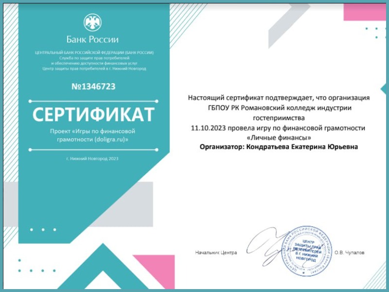 гостеприимства Кондратьева Екатерина Юрьевна,