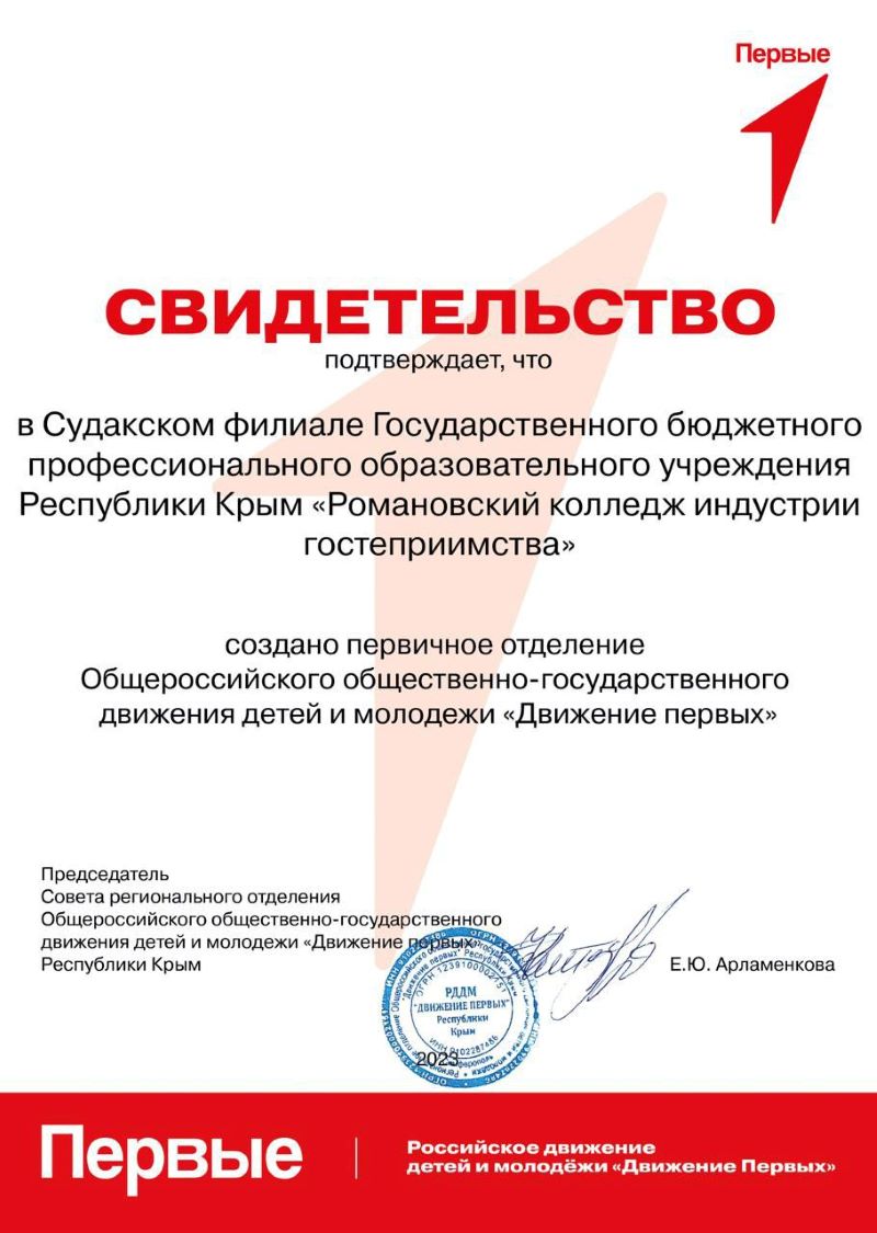 В Судакском филиале ГБПОУ РК «Романовский колледж индустрии гостеприимства» создано первичное отделение Общероссийского общественно-государственного движения для детей и молодежи «Движение первых».