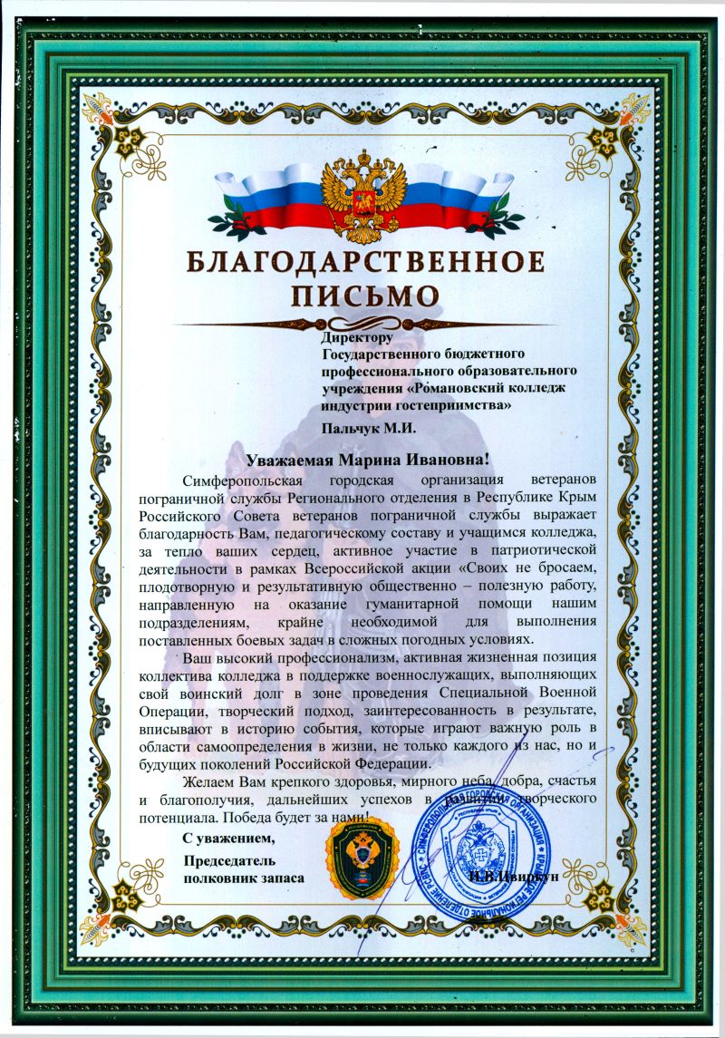 В рамках Всероссийской акции «Своих не бросаем» Симферопольская городская организация ветеранов пограничной службы Регионального отделения в Республике Крым Российского Совета ветеранов пограничной службы в лице председателя, полковника запаса Цвиркуна И.В. выразила благодарность директору ГБПОУ РК «Романовский колледж индустрии гостеприимства», доктору педагогических наук, доценту Пальчук М.И., педагогическому коллективу и обучающимся колледжа за активную жизненную позицию, плодотворную и результативную общественно-полезную работу, направленную на оказание гуманитарной помощи подразделениям, выполняющих свой воинский долг в зоне СВО.