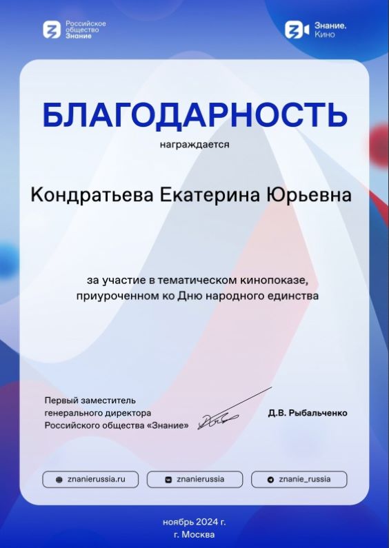 Благодарности за участие во Всероссийском просветительском проекте Знание.Кино!