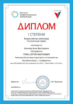 с I местом во Всероссийской онлайн-олимпиаде в номинации «Гостиничное дело (для студентов СПО)»