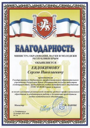 колледж индустрии гостеприимства» Евдокимову Сергею Николаевичу.